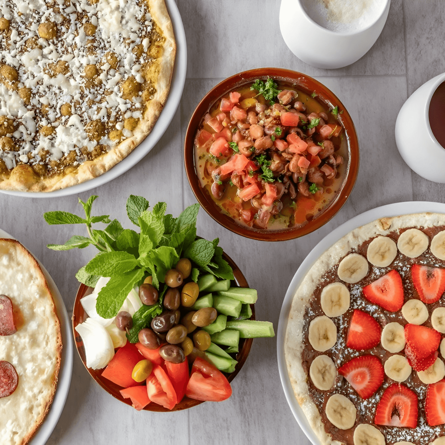Our Mediterranean version of breakfast pizzas feature choices like zesty zaatar and Mediterranean cheese, basturma (cured beef) and Mediterranean cheese, and sujuk (Armenian sausage) with Mediterranean cheese.